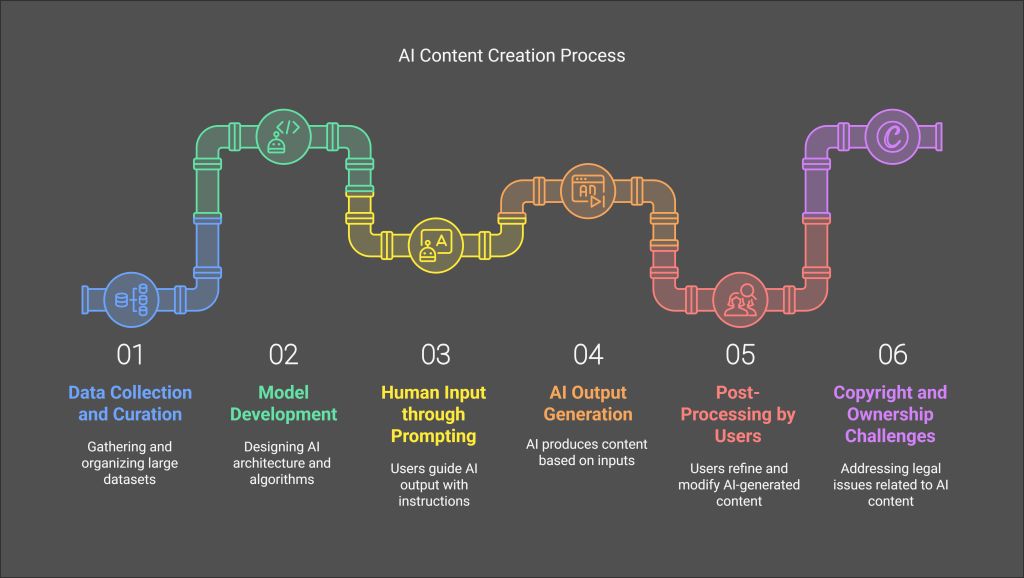 The real problem that all legislators around the world must confront while attempting to craft laws, is the chain of creation complexity. When we talk about AI-generated content, we’re actually discussing a complex chain of creation that involves multiple stages and players. It starts with massive data collection and curation, where training datasets are assembled from various works – many of them copyrighted. This data then feeds into the model development phase, where engineers and researchers craft the AI’s architecture and training algorithms. While these technical components aren’t typically considered creative works themselves, they’re crucial tools in the generative process.
