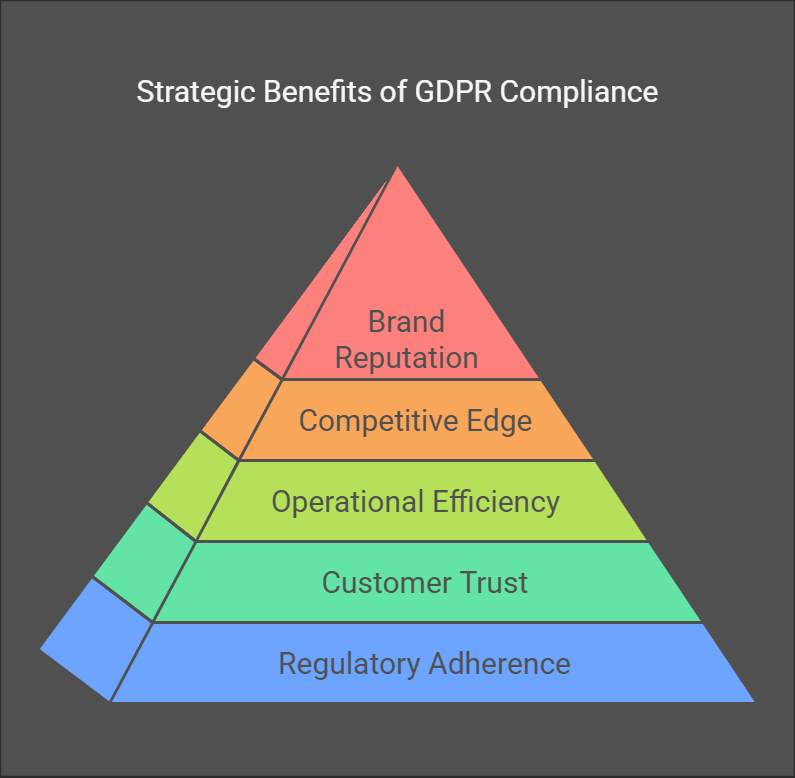 Achieving GDPR compliance not only ensures regulatory adherence but also offers strategic benefits, such as building customer trust, enhancing operational efficiency, and potentially gaining a competitive edge in the market. By prioritizing data privacy, businesses can differentiate themselves, reduce risks, and improve overall business continuity, ultimately leading to a stronger brand reputation and improved customer loyalty.
